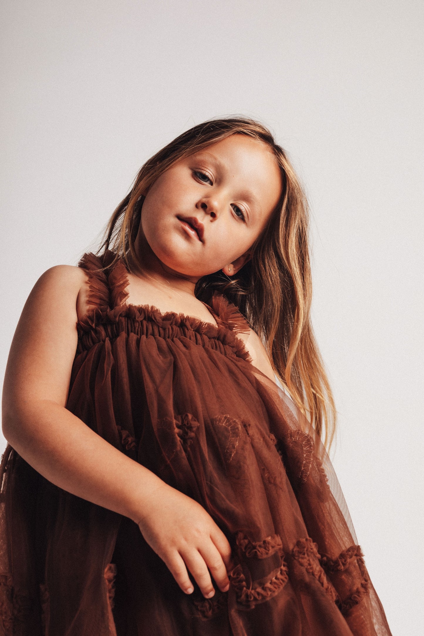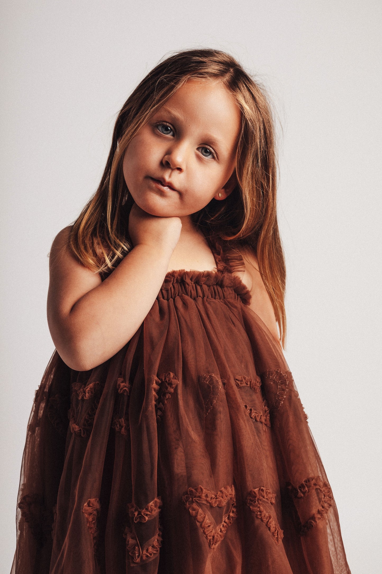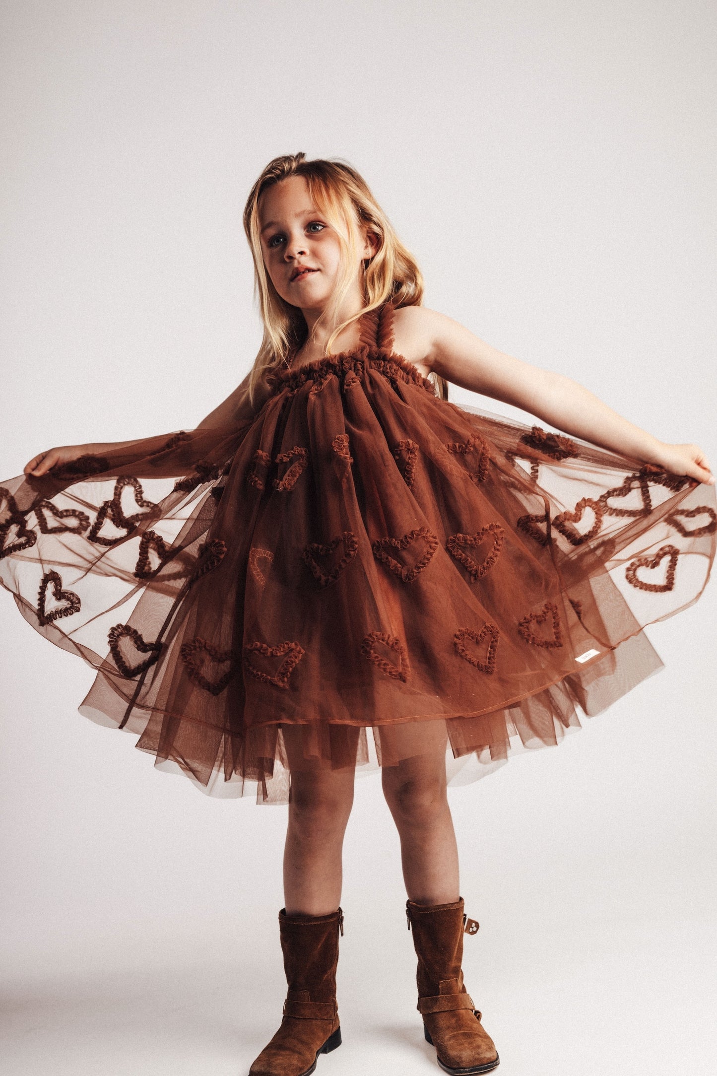 De eyecatcher van de meiden collectie Javea Dit speelse jurkje in een warme bruintint heeft een romantische en luchtige uitstraling. De fijne tule laag met geborduurde hartjes zorgt voor een dromerig effect, terwijl de smalle schouderbandjes en zwierige rok het ontwerp licht en elegant maken. Perfect voor feestelijke momenten en bijzondere dagen. Luchtige tule stof, dus erg comfortabel Verkrijgbaar in een bruin en roze Rint Geborduurde hartjes en fijne schouderbandjes Zwierige comfortabele pasvorm