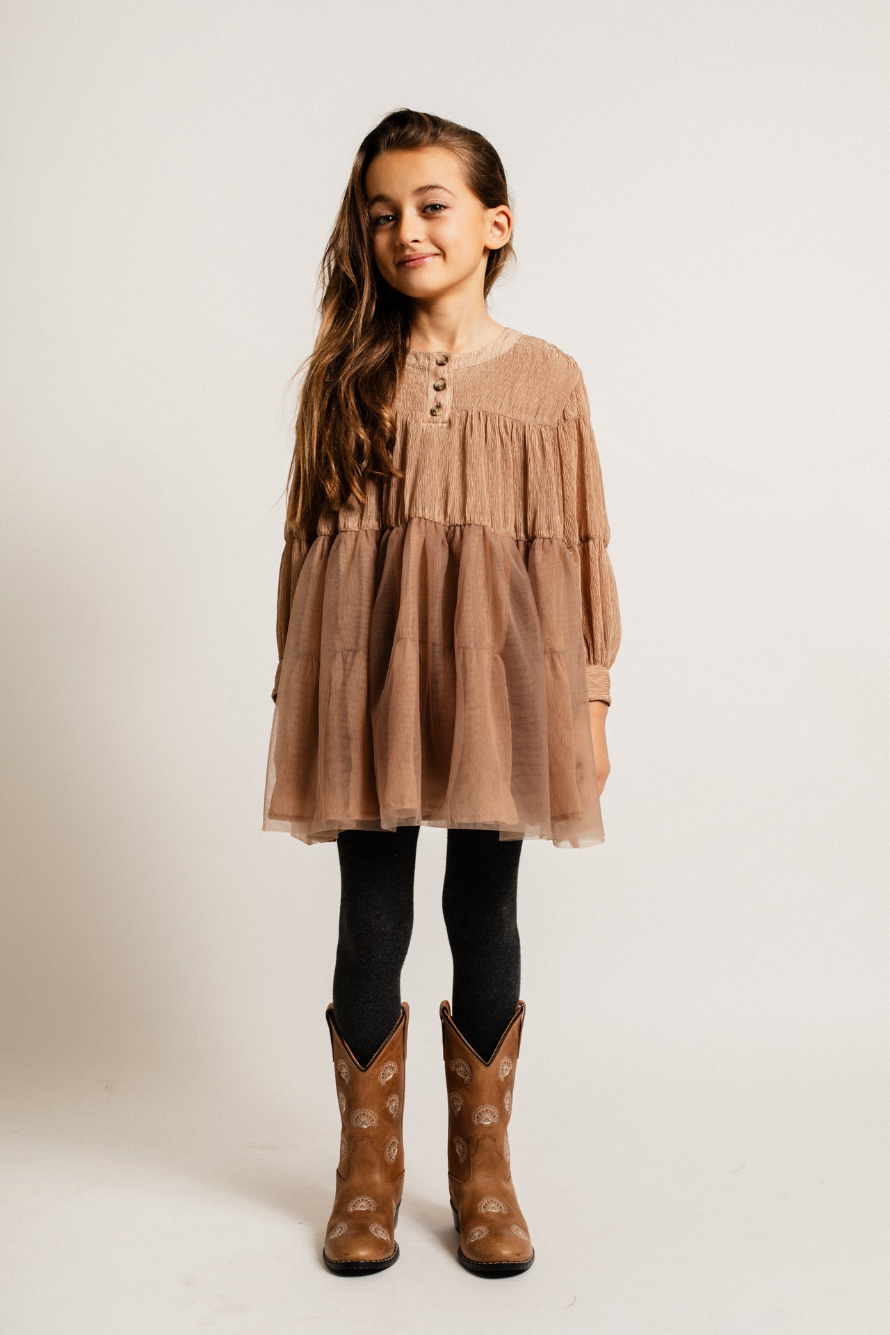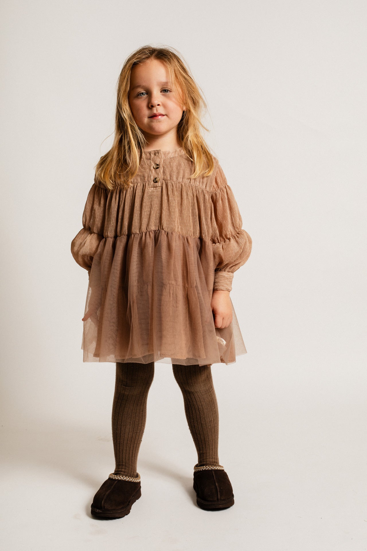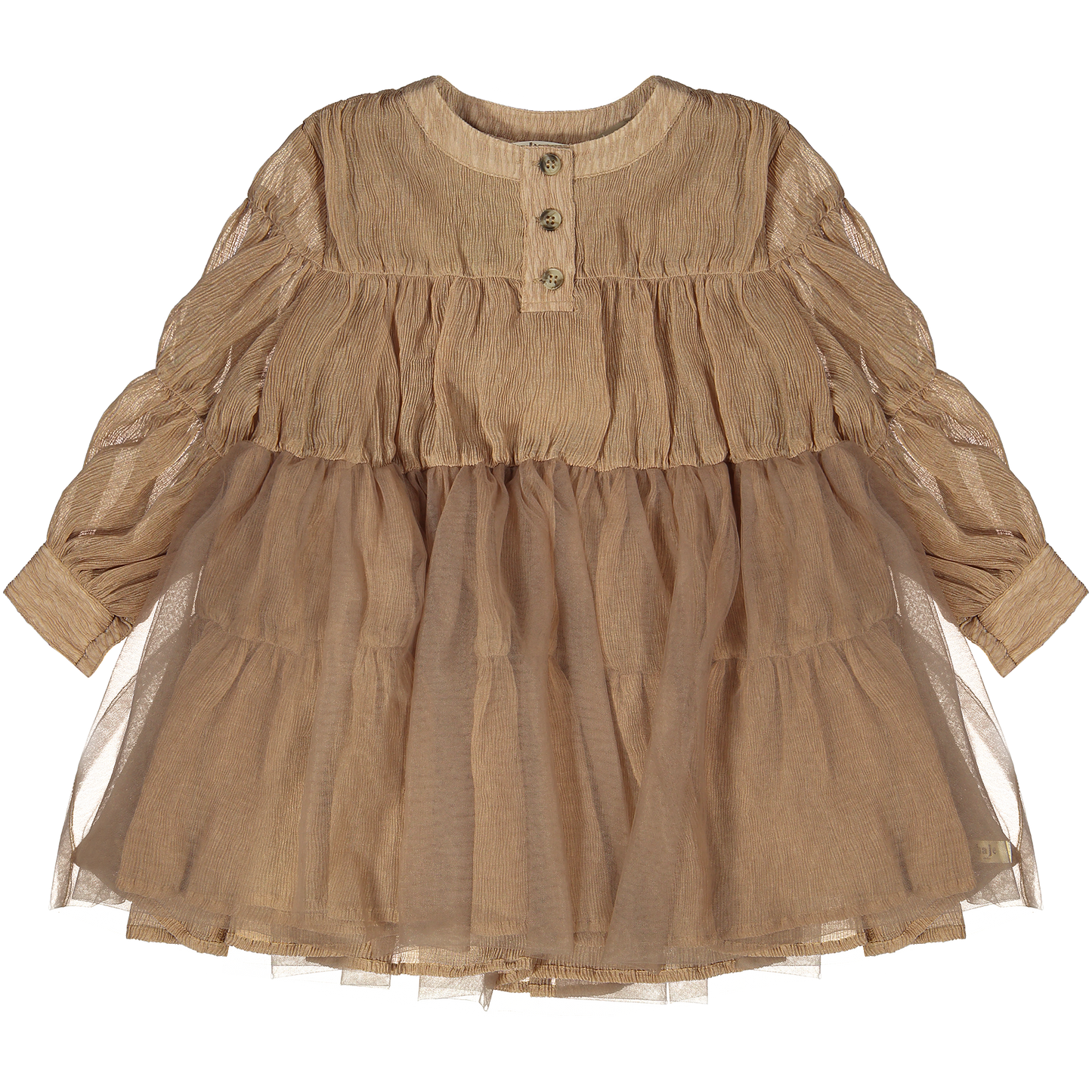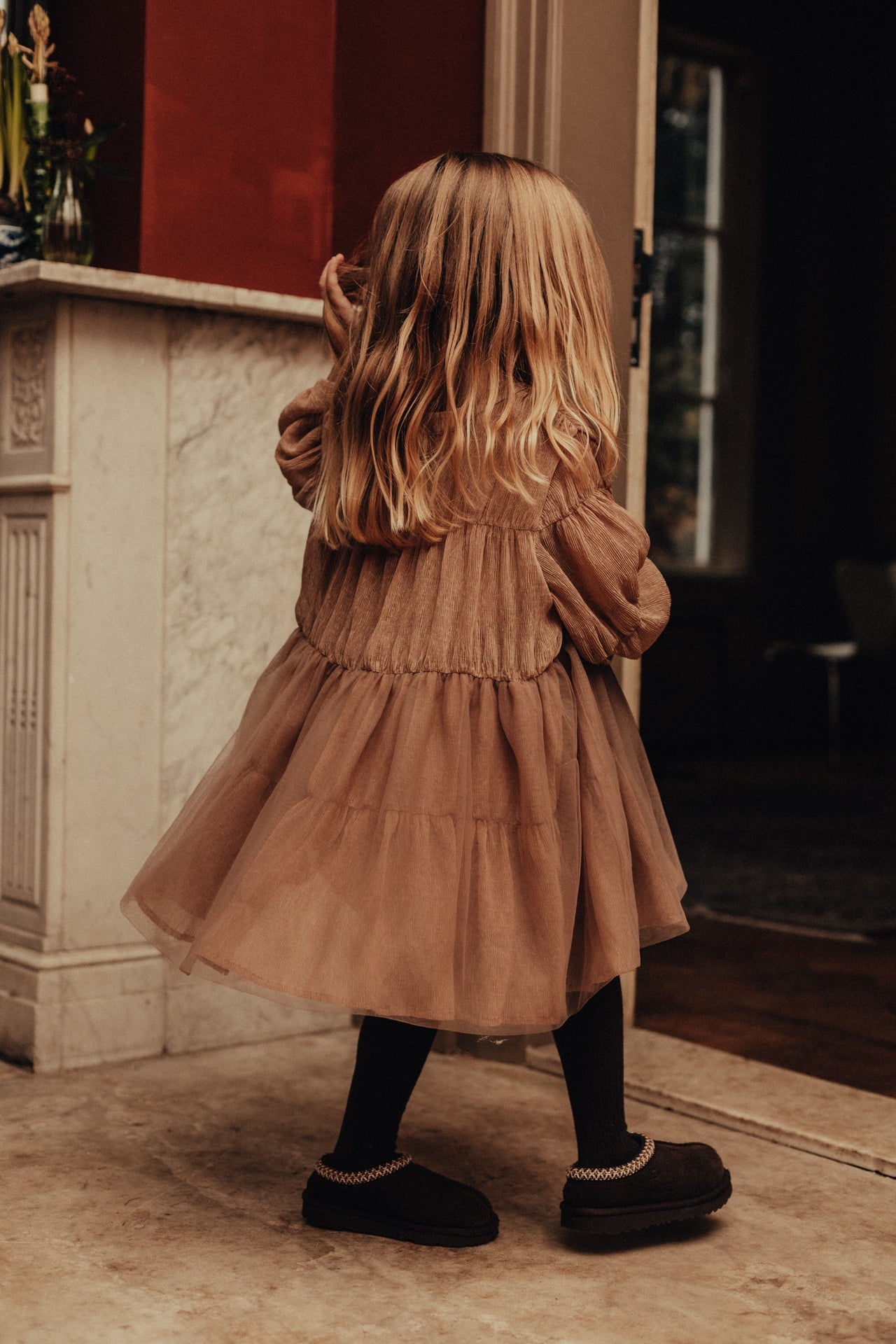 De pofmouwen en de gelaagde rok zorgen voor een charmante uitstraling, terwijl de neutrale bruine tint de jurk perfect maakt om te combineren met maillots of vestjes uit de collectie. Een echte must-have eyecatcher voor feestjes, verjaardagen en bijzondere gelegenheden.