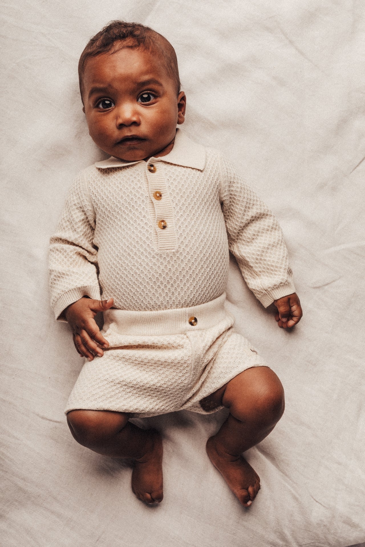 Gebreide romper lange mouwen- baby ruffles Deze gebreide romper met lange mouwen heeft een klassieke polo-uitstraling dankzij de zachte kraag en de knoopsluiting aan de voorzijde. Het verfijnde ajourpatroon geeft een elegante touch, terwijl de comfortabele pasvorm en drukknoopjes onderaan het verschonen extra makkelijk maken. Een stijlvol en praktisch item voor elke dag. Fijn draag comfort perfect voor de mini’s Warm maar toch luchtig