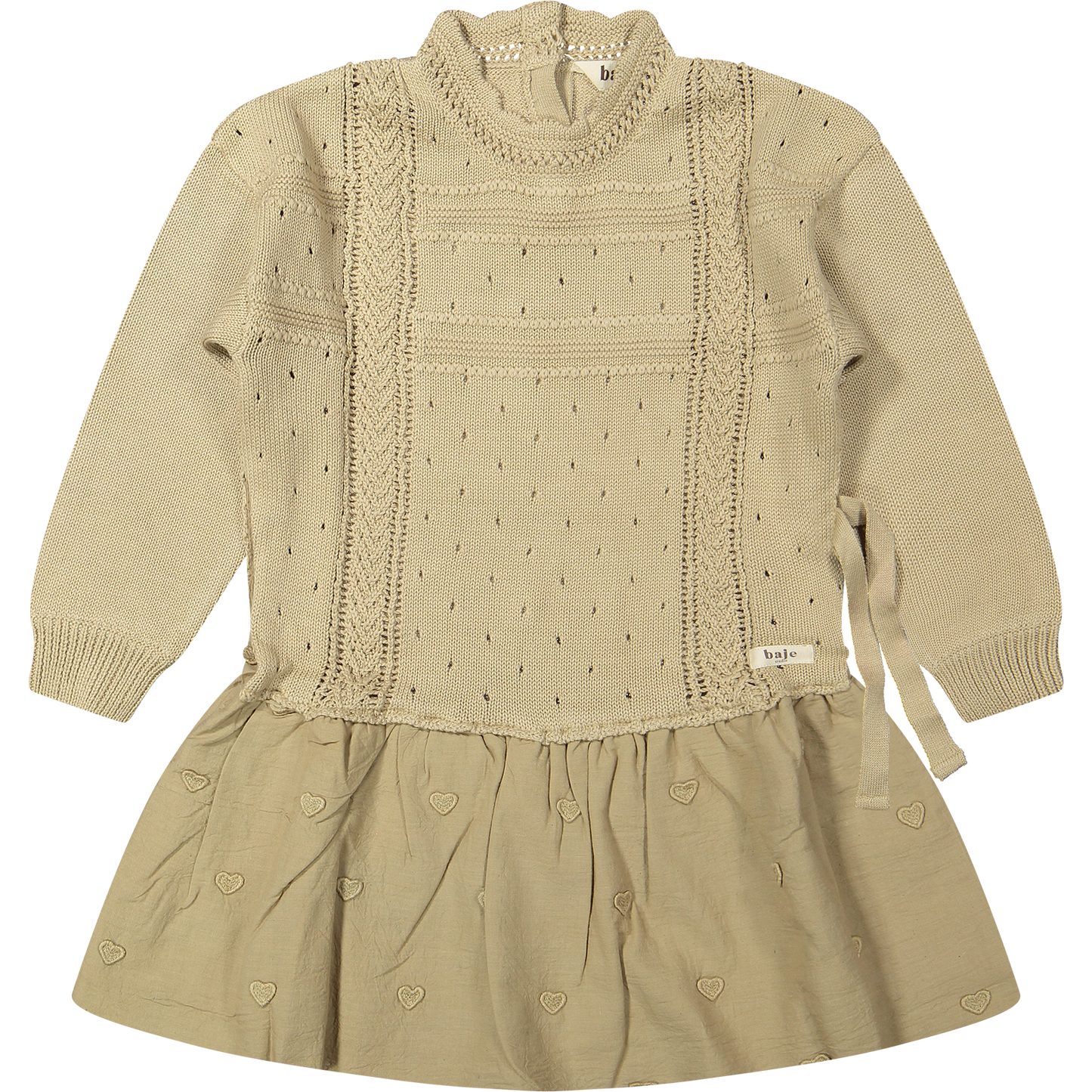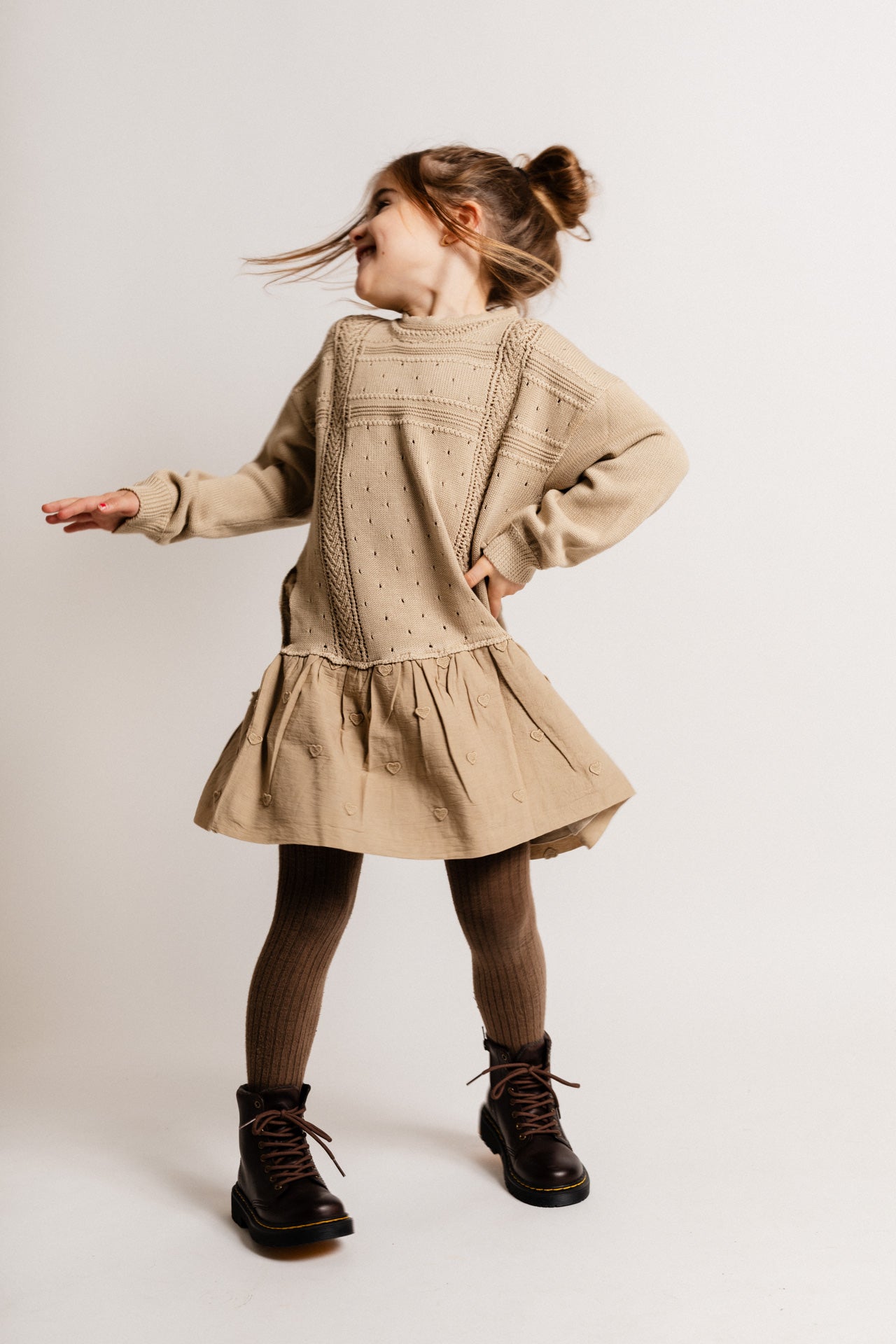 Het bovenstuk van zachte knitwear geeft de jurk een warme, comfortabele uitstraling en voelt heerlijk zacht aan op de huid. De verfijnde gebreide details rondom de hals en borst zorgen voor een luxe uitstraling en maken dit item extra bijzonder. De rok is geweven en afgewerkt met subtiel ingeweven hartjes, die zorgen voor een speels en meisjesachtig effect.