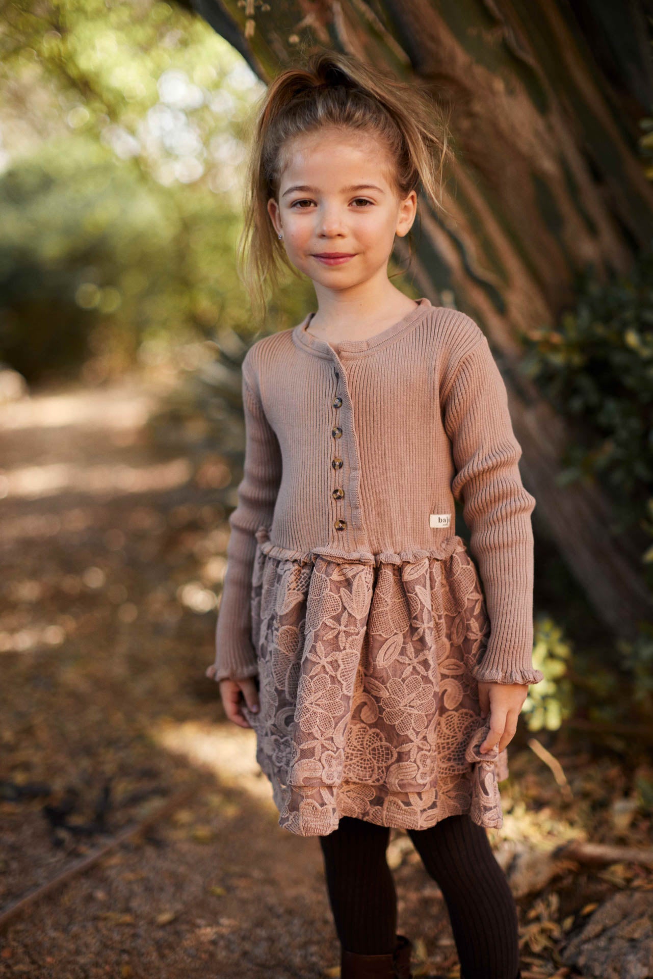 De Marieze jurk van Baje Studio is een warme winterfavoriet die elegantie en comfort combineert. Het bovenstuk is gemaakt van zachte rib-knit stof die heerlijk warm en stretchy is, terwijl de volle rok is uitgevoerd in rijkelijk geborduurde tule voor een romantische uitstraling. Dankzij de knoopsluiting aan de voorkant en de verfijnde afwerking is dit jurkje zowel praktisch als stijlvol.