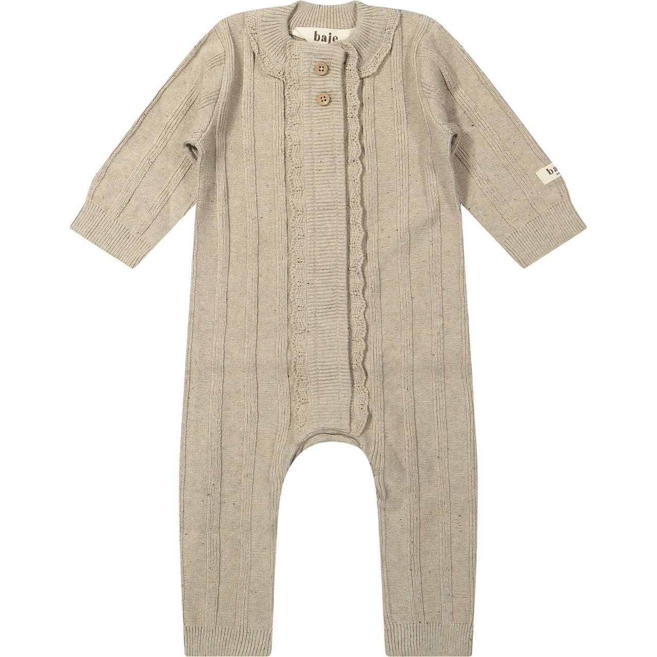 Deze gebreide baby jumpsuit van Baje combineert comfort en stijl in één. Gemaakt van hoogwaardig 100% katoen, voelt dit pakje heerlijk zacht en ademend aan – ideaal voor de gevoelige babyhuid. De subtiele zandkleur en het verfijnde breipatroon met verticale strepen geven de jumpsuit een klassieke en tijdloze uitstraling.