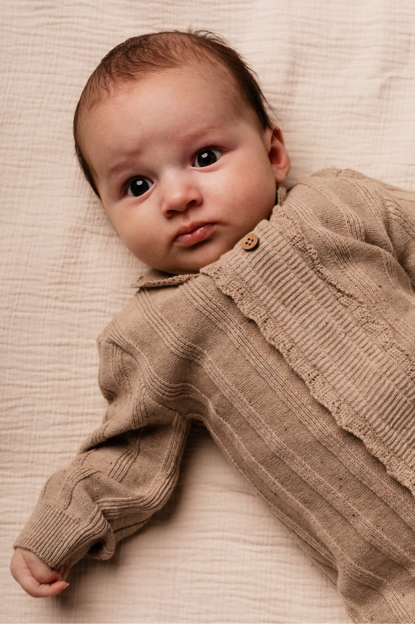 Baje baby jumpsuit – zand – gebreid katoen met ruffle detail