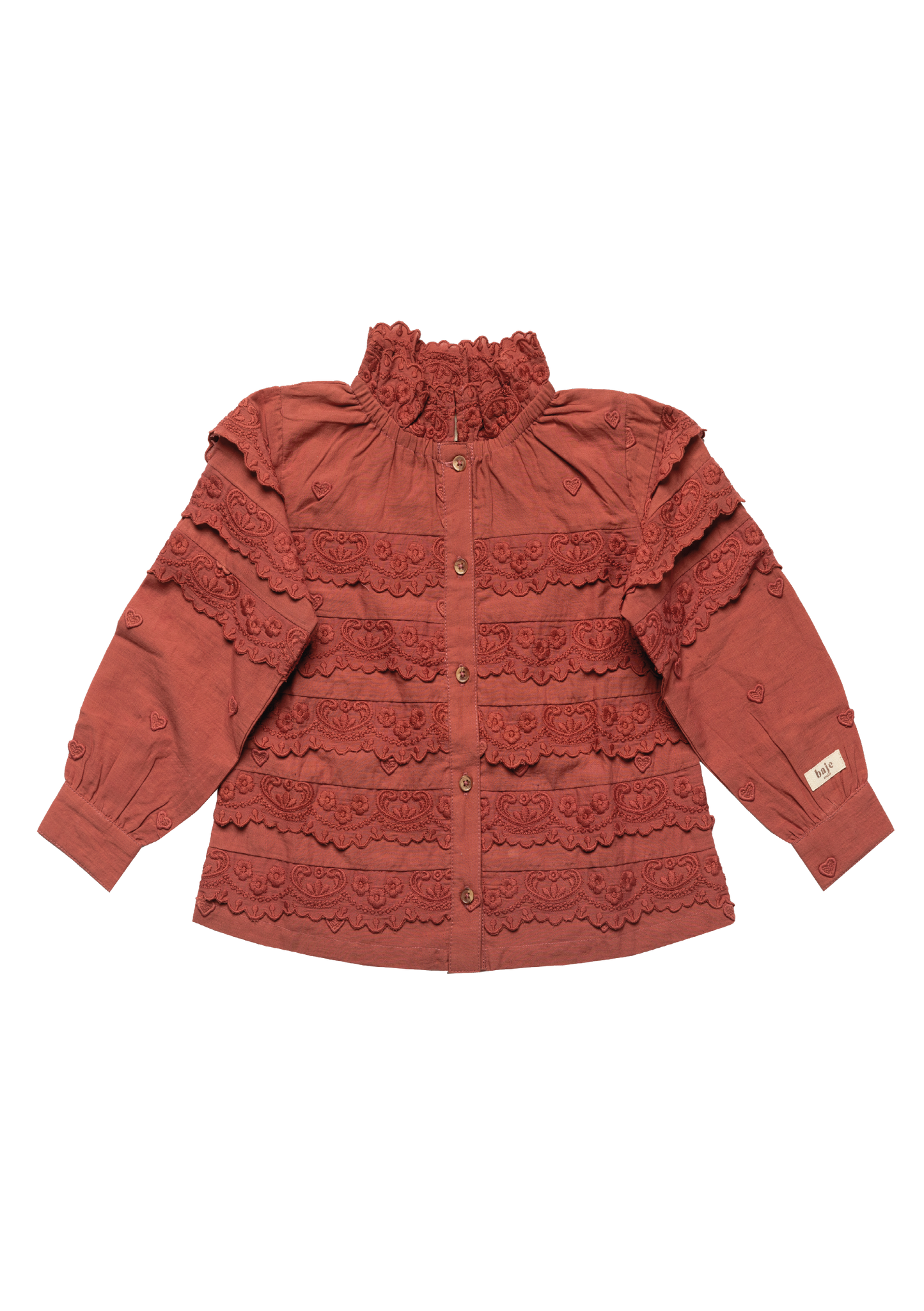 Deze stijlvolle meisjes blouse met lange mouwen is een echte eyecatcher. De blouse is uitgevoerd in een zachte zandkleur en voorzien van prachtige borduurdetails en hartjesmotiefjes. De rijen met geborduurde stroken en de hoge hals met ruches geven de blouse een romantische, maar toch speelse uitstraling.
